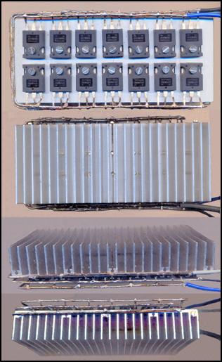 After ordering a smaller heat sink, I mounted the 14 transistors on it in two rows. (This is also good for testing.) The result was encouraging. I connected the large spiral coil to it as a load and controlled it with a CMOS wave from a signal generator. I set the control voltage amplitude to 10 V. At a 12 V supply voltage, 5 A flowed through the transistors, which did not cause any heating. I increased the supply voltage to 24 V. At this point, 12 A flowed through the transistors, which caused them to heat up a little. In the case of an inductive load, this is a very good value. This means that the maximum current for an ohmic load can reach 25 A. However, the excitation has not stopped. If the control unit to be developed by Miboxer includes a circuit that cuts off self-induction voltage peaks, the inductive load capacity can go up to 15 A. It does not depend on the MOSFETs, because they can still handle 16 A, although they have already become very hot here. Unfortunately, due to the lack of the Miboxer controller, I cannot complete this development. However, I would also need a high-performance square wave generator for my further work.